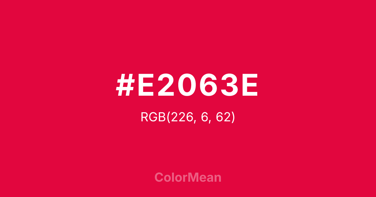 #E2063E RGB value is (226, 6, 62). The hex color red value is 226, green is 6, and blue is 62. Its HSL format shows a hue of 345°, saturation of 95 percent, and lightness of 45 percent. The CMYK process values are 0 percent, 97 percent, 73 percent, 11 percent.
