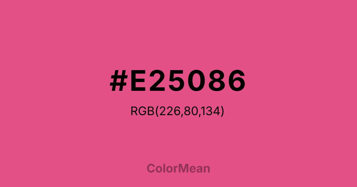 #E25086 RGB value is (226, 80, 134). The hex color red value is 226, green is 80, and blue is 134. Its HSL format shows a hue of 338°, saturation of 72 percent, and lightness of 60 percent. The CMYK process values are 0 percent, 65 percent, 41 percent, 11 percent.