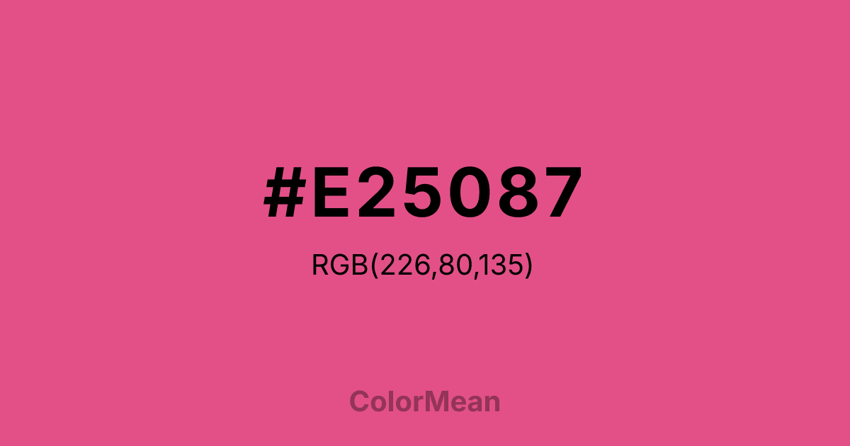 #E25087 RGB value is (226, 80, 135). The hex color red value is 226, green is 80, and blue is 135. Its HSL format shows a hue of 337°, saturation of 72 percent, and lightness of 60 percent. The CMYK process values are 0 percent, 65 percent, 40 percent, 11 percent.