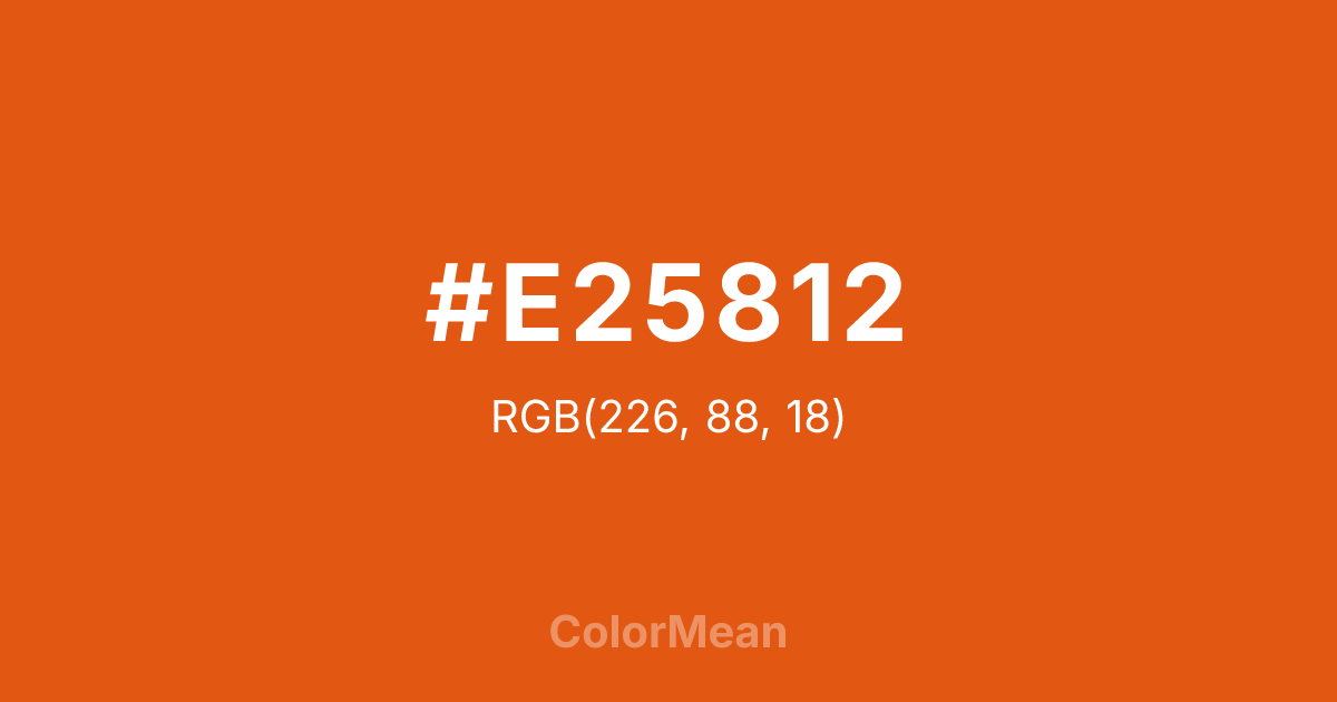 #E25812 RGB value is (226, 88, 18). The hex color red value is 226, green is 88, and blue is 18. Its HSL format shows a hue of 20°, saturation of 85 percent, and lightness of 48 percent. The CMYK process values are 0 percent, 61 percent, 92 percent, 11 percent.
