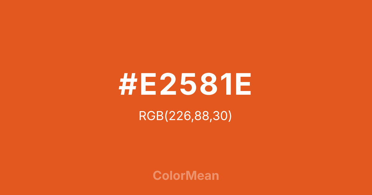 #E2581E RGB value is (226, 88, 30). The hex color red value is 226, green is 88, and blue is 30. Its HSL format shows a hue of 18°, saturation of 77 percent, and lightness of 50 percent. The CMYK process values are 0 percent, 61 percent, 87 percent, 11 percent.