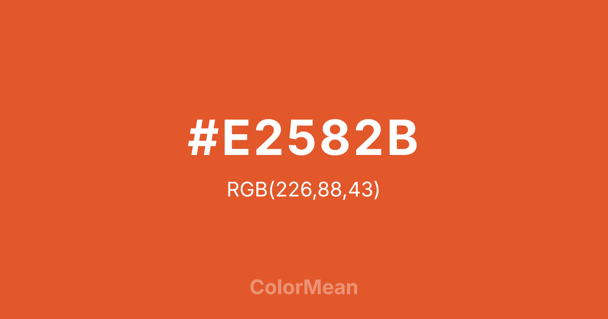 #E2582B RGB value is (226, 88, 43). The hex color red value is 226, green is 88, and blue is 43. Its HSL format shows a hue of 15°, saturation of 76 percent, and lightness of 53 percent. The CMYK process values are 0 percent, 61 percent, 81 percent, 11 percent.