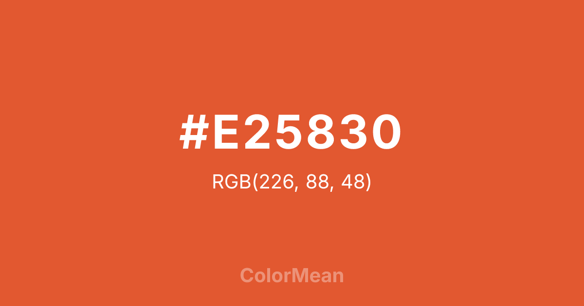 #E25830 RGB value is (226, 88, 48). The hex color red value is 226, green is 88, and blue is 48. Its HSL format shows a hue of 13°, saturation of 75 percent, and lightness of 54 percent. The CMYK process values are 0 percent, 61 percent, 79 percent, 11 percent.