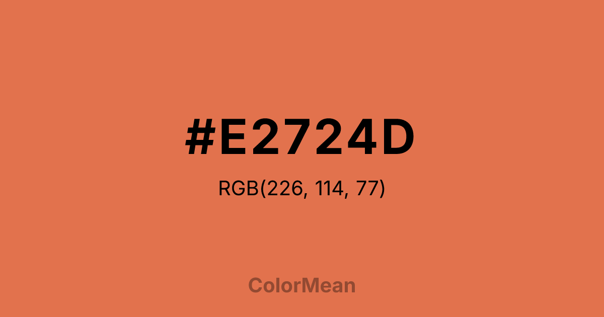 #E2724D RGB value is (226, 114, 77). The hex color red value is 226, green is 114, and blue is 77. Its HSL format shows a hue of 15°, saturation of 72 percent, and lightness of 59 percent. The CMYK process values are 0 percent, 50 percent, 66 percent, 11 percent.