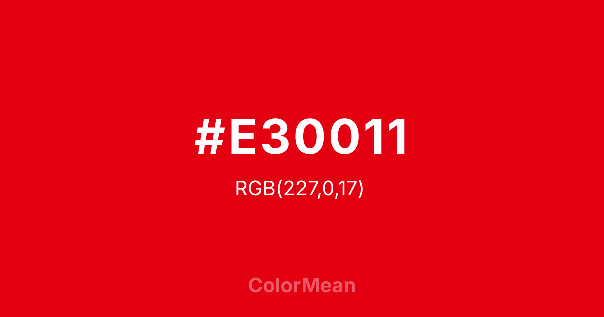 #E30011 RGB value is (227, 0, 17). The hex color red value is 227, green is 0, and blue is 17. Its HSL format shows a hue of 356°, saturation of 100 percent, and lightness of 45 percent. The CMYK process values are 0 percent, 100 percent, 93 percent, 11 percent.