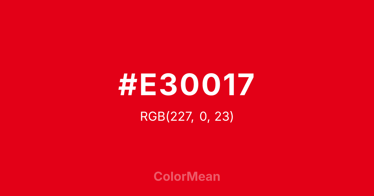 #E30017 RGB value is (227, 0, 23). The hex color red value is 227, green is 0, and blue is 23. Its HSL format shows a hue of 354°, saturation of 100 percent, and lightness of 45 percent. The CMYK process values are 0 percent, 100 percent, 90 percent, 11 percent.