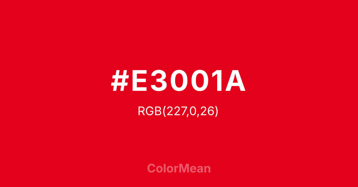 #E3001A RGB value is (227, 0, 26). The hex color red value is 227, green is 0, and blue is 26. Its HSL format shows a hue of 353°, saturation of 100 percent, and lightness of 45 percent. The CMYK process values are 0 percent, 100 percent, 89 percent, 11 percent.