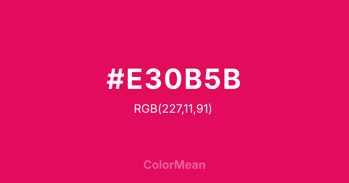 #E30B5B RGB value is (227, 11, 91). The hex color red value is 227, green is 11, and blue is 91. Its HSL format shows a hue of 338°, saturation of 91 percent, and lightness of 47 percent. The CMYK process values are 0 percent, 95 percent, 60 percent, 11 percent.