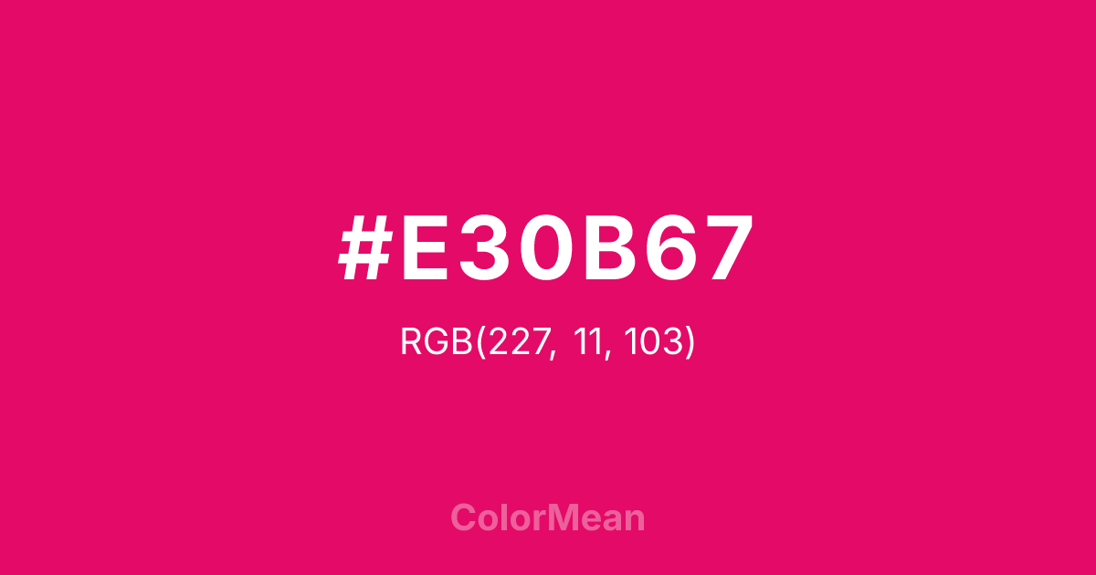 #E30B67 RGB value is (227, 11, 103). The hex color red value is 227, green is 11, and blue is 103. Its HSL format shows a hue of 334°, saturation of 91 percent, and lightness of 47 percent. The CMYK process values are 0 percent, 95 percent, 55 percent, 11 percent.