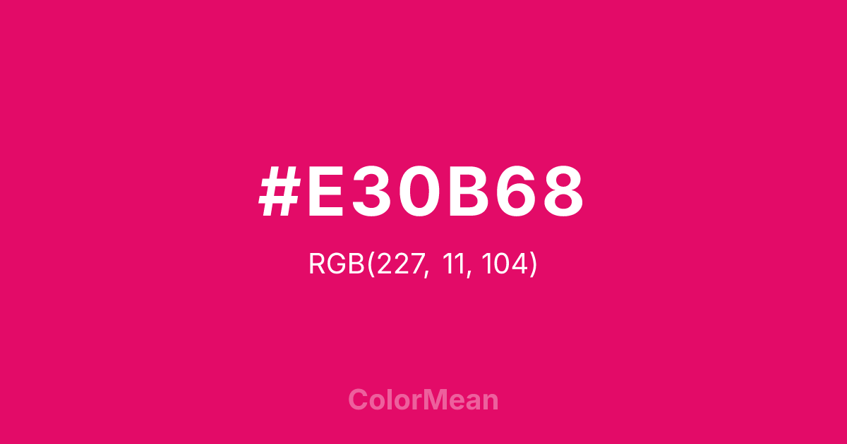 #E30B68 RGB value is (227, 11, 104). The hex color red value is 227, green is 11, and blue is 104. Its HSL format shows a hue of 334°, saturation of 91 percent, and lightness of 47 percent. The CMYK process values are 0 percent, 95 percent, 54 percent, 11 percent.