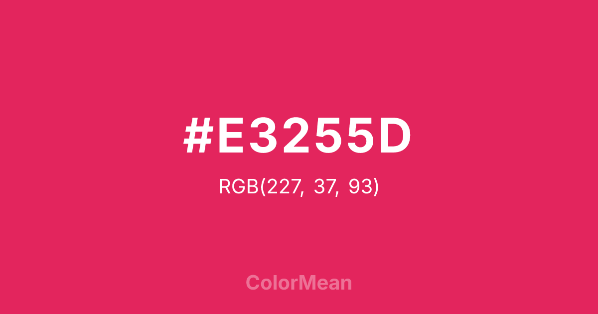 #E3255D RGB value is (227, 37, 93). The hex color red value is 227, green is 37, and blue is 93. Its HSL format shows a hue of 342°, saturation of 77 percent, and lightness of 52 percent. The CMYK process values are 0 percent, 84 percent, 59 percent, 11 percent.