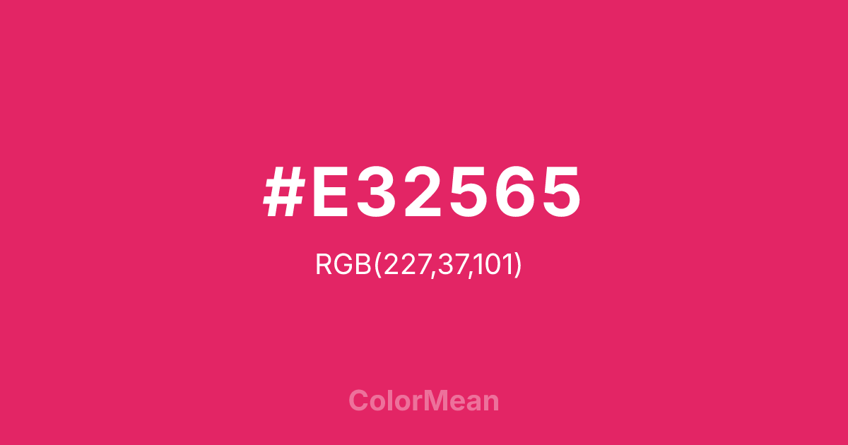 #E32565 RGB value is (227, 37, 101). The hex color red value is 227, green is 37, and blue is 101. Its HSL format shows a hue of 340°, saturation of 77 percent, and lightness of 52 percent. The CMYK process values are 0 percent, 84 percent, 56 percent, 11 percent.