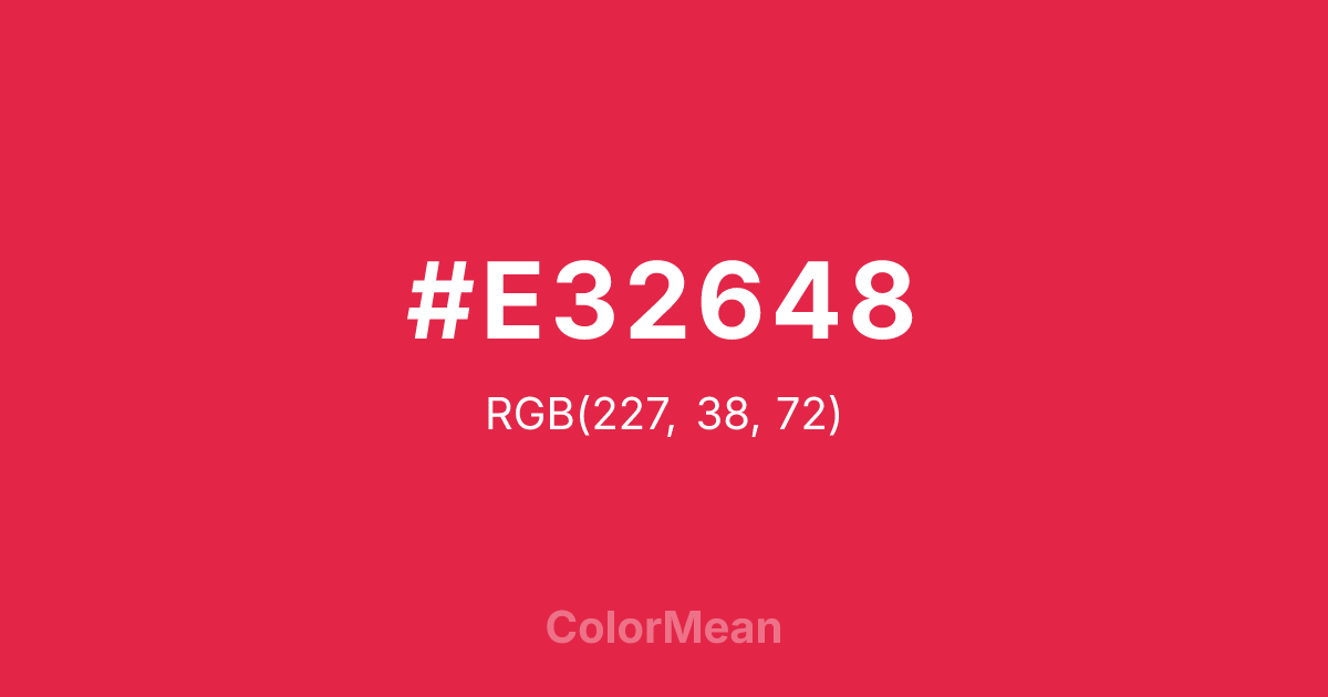 #E32648 RGB value is (227, 38, 72). The hex color red value is 227, green is 38, and blue is 72. Its HSL format shows a hue of 349°, saturation of 77 percent, and lightness of 52 percent. The CMYK process values are 0 percent, 83 percent, 68 percent, 11 percent.