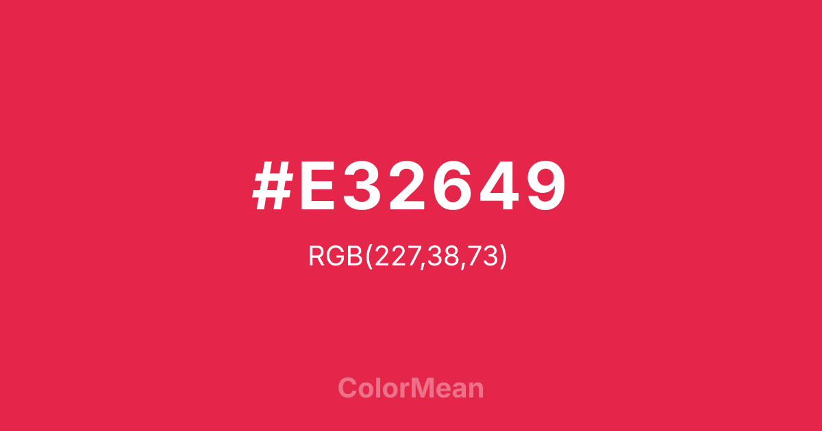 #E32649 RGB value is (227, 38, 73). The hex color red value is 227, green is 38, and blue is 73. Its HSL format shows a hue of 349°, saturation of 77 percent, and lightness of 52 percent. The CMYK process values are 0 percent, 83 percent, 68 percent, 11 percent.
