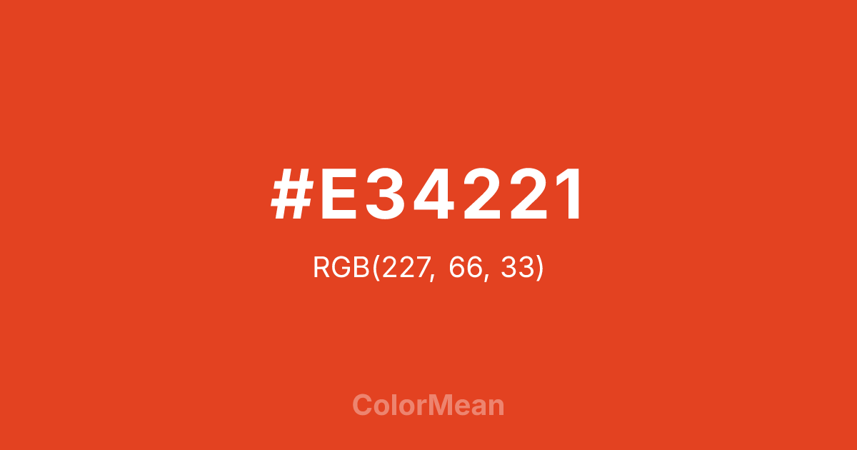 #E34221 RGB value is (227, 66, 33). The hex color red value is 227, green is 66, and blue is 33. Its HSL format shows a hue of 10°, saturation of 78 percent, and lightness of 51 percent. The CMYK process values are 0 percent, 71 percent, 85 percent, 11 percent.