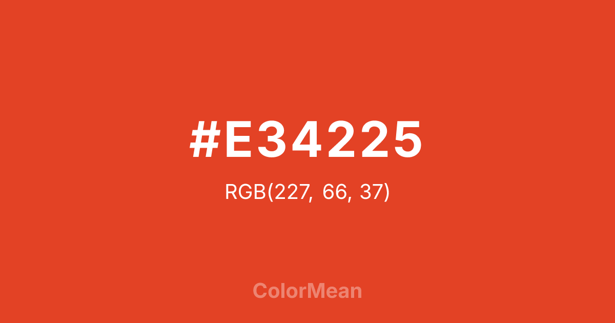 #E34225 RGB value is (227, 66, 37). The hex color red value is 227, green is 66, and blue is 37. Its HSL format shows a hue of 9°, saturation of 77 percent, and lightness of 52 percent. The CMYK process values are 0 percent, 71 percent, 84 percent, 11 percent.