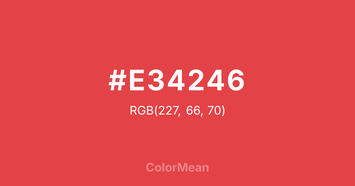 #E34246 RGB value is (227, 66, 70). The hex color red value is 227, green is 66, and blue is 70. Its HSL format shows a hue of 359°, saturation of 74 percent, and lightness of 57 percent. The CMYK process values are 0 percent, 71 percent, 69 percent, 11 percent.