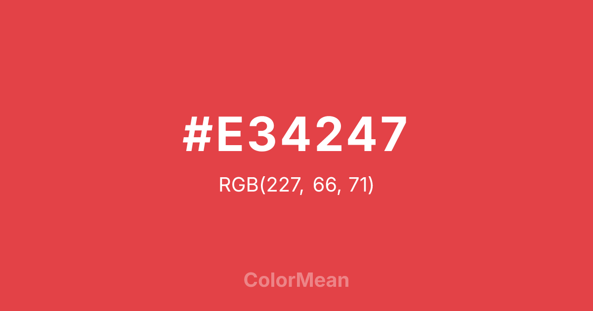 #E34247 RGB value is (227, 66, 71). The hex color red value is 227, green is 66, and blue is 71. Its HSL format shows a hue of 358°, saturation of 74 percent, and lightness of 57 percent. The CMYK process values are 0 percent, 71 percent, 69 percent, 11 percent.