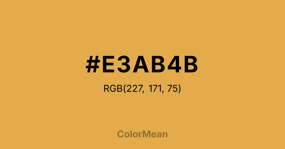 #E3AB4B RGB value is (227, 171, 75). The hex color red value is 227, green is 171, and blue is 75. Its HSL format shows a hue of 38°, saturation of 73 percent, and lightness of 59 percent. The CMYK process values are 0 percent, 25 percent, 67 percent, 11 percent.