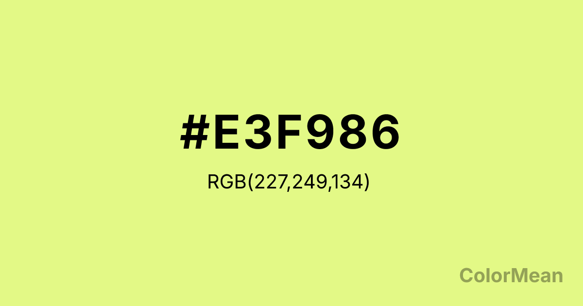 #E3F986 RGB value is (227, 249, 134). The hex color red value is 227, green is 249, and blue is 134. Its HSL format shows a hue of 71°, saturation of 91 percent, and lightness of 75 percent. The CMYK process values are 9 percent, 0 percent, 46 percent, 2 percent.
