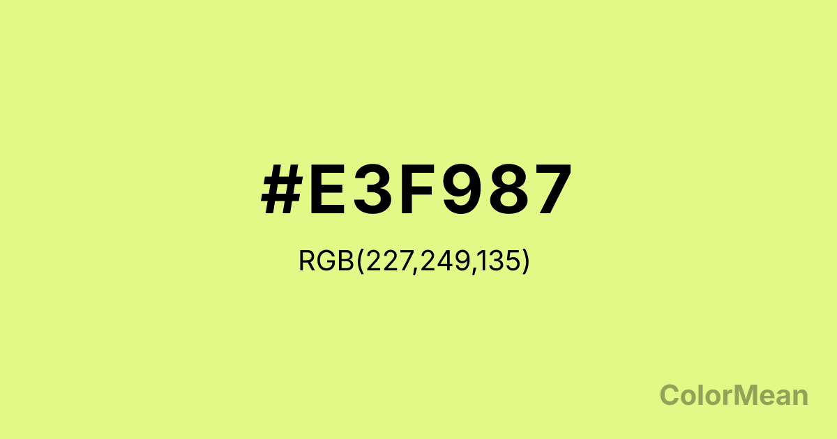 #E3F987 RGB value is (227, 249, 135). The hex color red value is 227, green is 249, and blue is 135. Its HSL format shows a hue of 72°, saturation of 90 percent, and lightness of 75 percent. The CMYK process values are 9 percent, 0 percent, 46 percent, 2 percent.