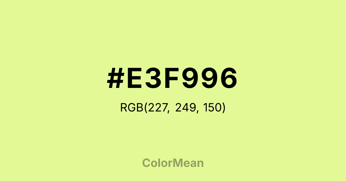 #E3F996 RGB value is (227, 249, 150). The hex color red value is 227, green is 249, and blue is 150. Its HSL format shows a hue of 73°, saturation of 89 percent, and lightness of 78 percent. The CMYK process values are 9 percent, 0 percent, 40 percent, 2 percent.