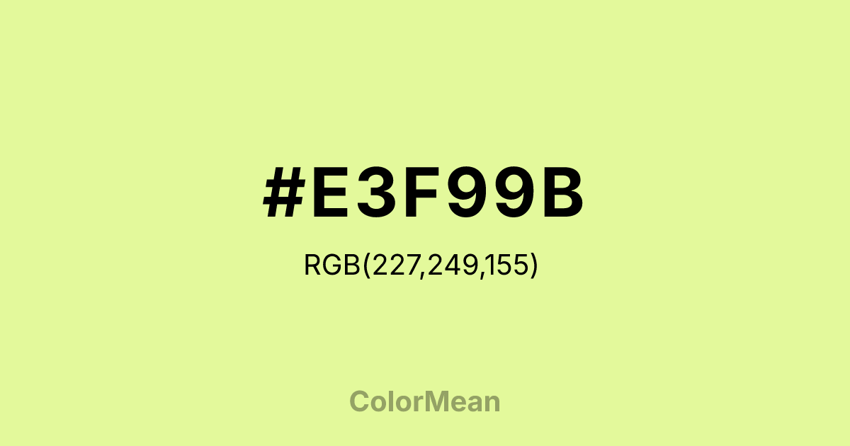 #E3F99B RGB value is (227, 249, 155). The hex color red value is 227, green is 249, and blue is 155. Its HSL format shows a hue of 74°, saturation of 89 percent, and lightness of 79 percent. The CMYK process values are 9 percent, 0 percent, 38 percent, 2 percent.