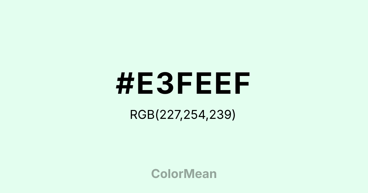 #E3FEEF RGB value is (227, 254, 239). The hex color red value is 227, green is 254, and blue is 239. Its HSL format shows a hue of 147°, saturation of 93 percent, and lightness of 94 percent. The CMYK process values are 11 percent, 0 percent, 6 percent, 0 percent.