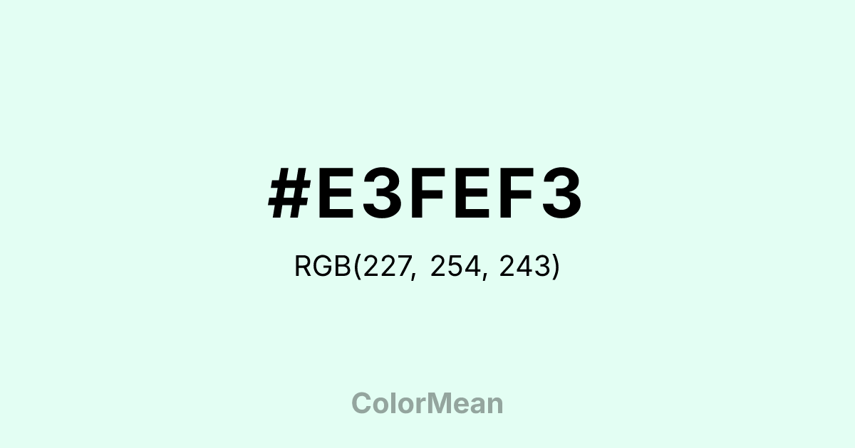 #E3FEF3 RGB value is (227, 254, 243). The hex color red value is 227, green is 254, and blue is 243. Its HSL format shows a hue of 156°, saturation of 93 percent, and lightness of 94 percent. The CMYK process values are 11 percent, 0 percent, 4 percent, 0 percent.