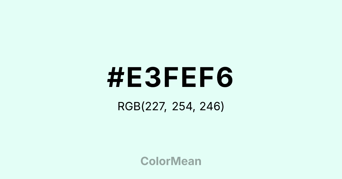 #E3FEF6 RGB value is (227, 254, 246). The hex color red value is 227, green is 254, and blue is 246. Its HSL format shows a hue of 162°, saturation of 93 percent, and lightness of 94 percent. The CMYK process values are 11 percent, 0 percent, 3 percent, 0 percent.