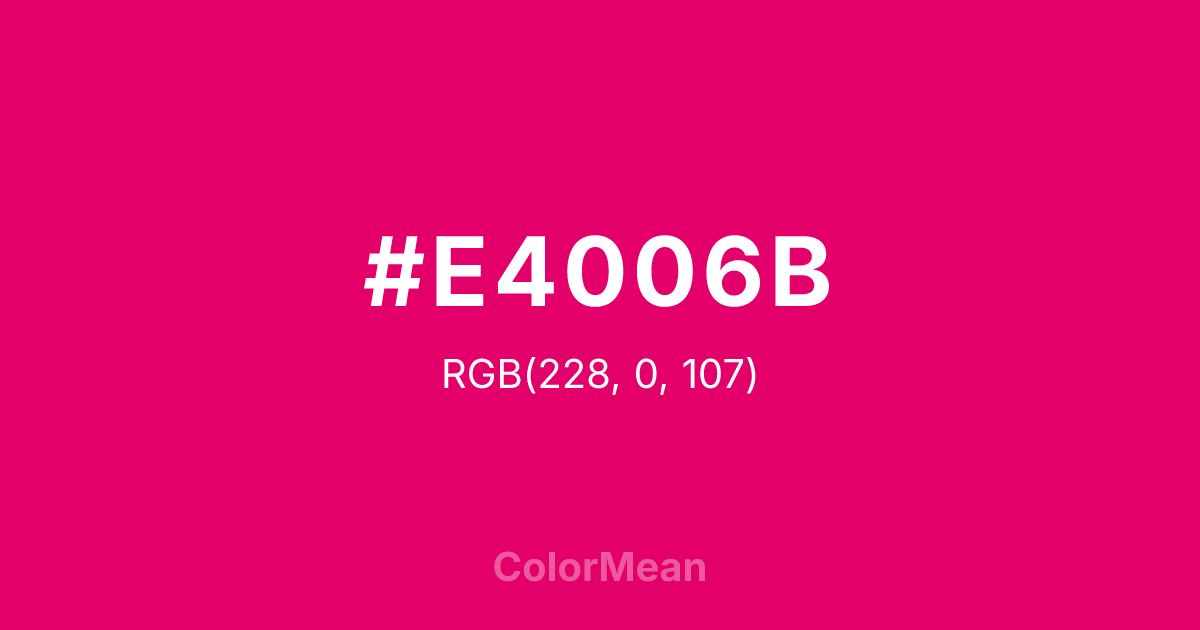 #E4006B RGB value is (228, 0, 107). The hex color red value is 228, green is 0, and blue is 107. Its HSL format shows a hue of 332°, saturation of 100 percent, and lightness of 45 percent. The CMYK process values are 0 percent, 100 percent, 53 percent, 11 percent.