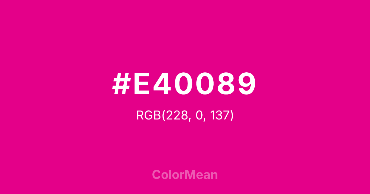 #E40089 RGB value is (228, 0, 137). The hex color red value is 228, green is 0, and blue is 137. Its HSL format shows a hue of 324°, saturation of 100 percent, and lightness of 45 percent. The CMYK process values are 0 percent, 100 percent, 40 percent, 11 percent.