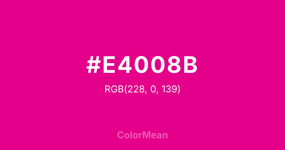 #E4008B RGB value is (228, 0, 139). The hex color red value is 228, green is 0, and blue is 139. Its HSL format shows a hue of 323°, saturation of 100 percent, and lightness of 45 percent. The CMYK process values are 0 percent, 100 percent, 39 percent, 11 percent.