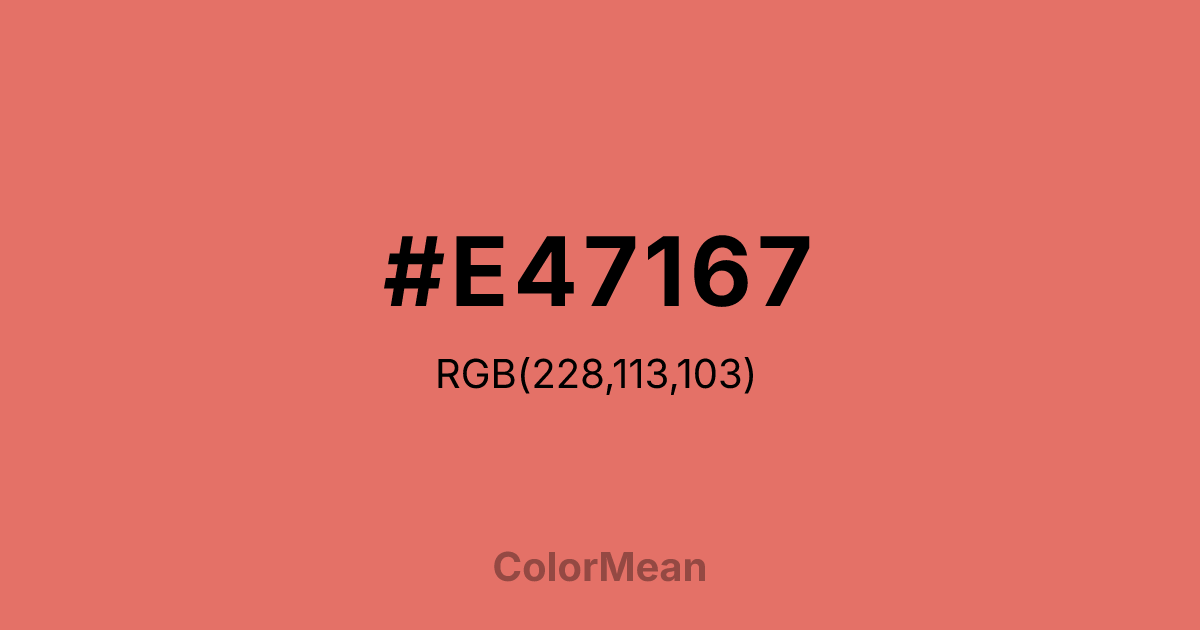 #E47167 RGB value is (228, 113, 103). The hex color red value is 228, green is 113, and blue is 103. Its HSL format shows a hue of 5°, saturation of 70 percent, and lightness of 65 percent. The CMYK process values are 0 percent, 50 percent, 55 percent, 11 percent.