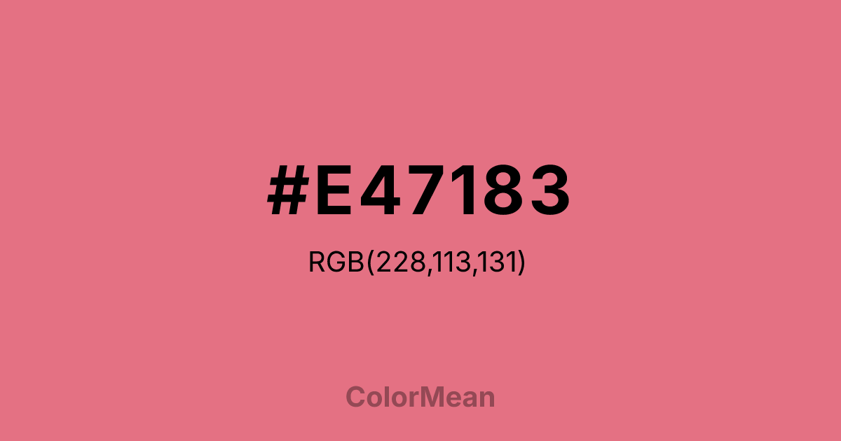 #E47183 RGB value is (228, 113, 131). The hex color red value is 228, green is 113, and blue is 131. Its HSL format shows a hue of 351°, saturation of 68 percent, and lightness of 67 percent. The CMYK process values are 0 percent, 50 percent, 43 percent, 11 percent.