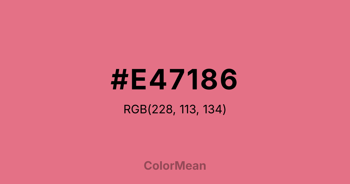 #E47186 RGB value is (228, 113, 134). The hex color red value is 228, green is 113, and blue is 134. Its HSL format shows a hue of 349°, saturation of 68 percent, and lightness of 67 percent. The CMYK process values are 0 percent, 50 percent, 41 percent, 11 percent.