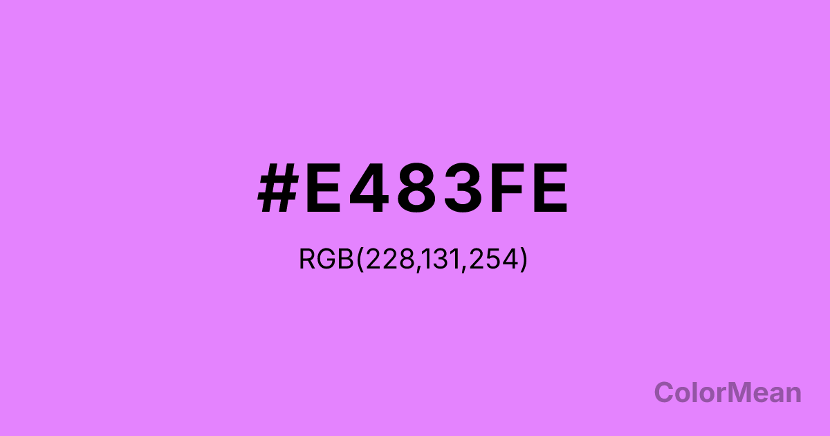 #E483FE RGB value is (228, 131, 254). The hex color red value is 228, green is 131, and blue is 254. Its HSL format shows a hue of 287°, saturation of 98 percent, and lightness of 75 percent. The CMYK process values are 10 percent, 48 percent, 0 percent, 0 percent.