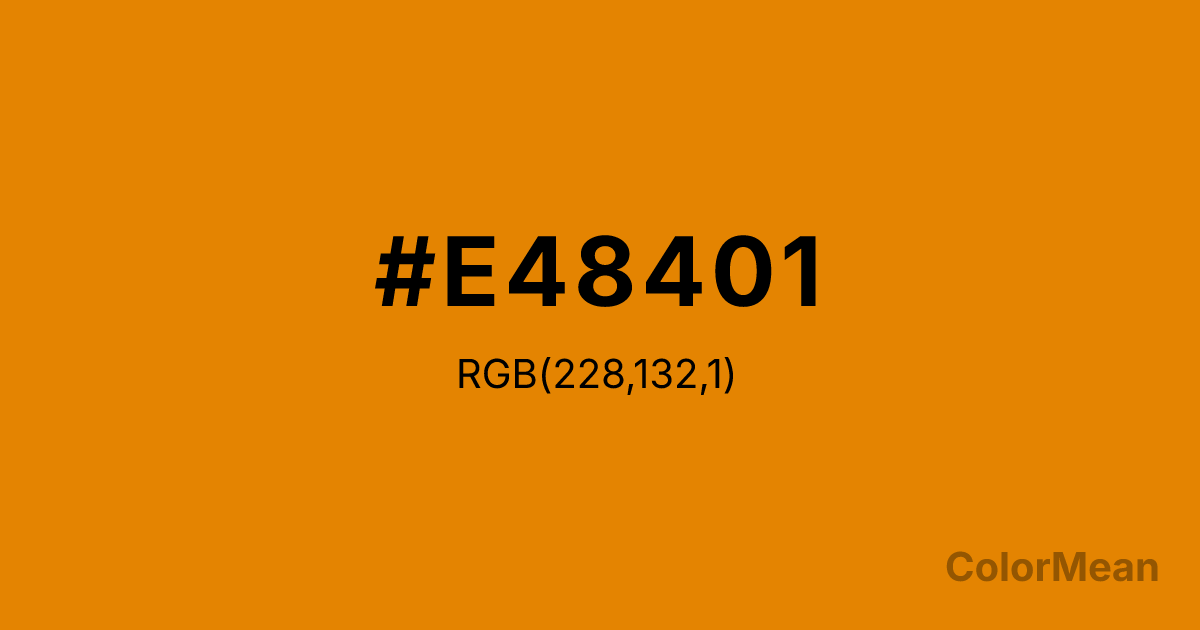 #E48401 RGB value is (228, 132, 1). The hex color red value is 228, green is 132, and blue is 1. Its HSL format shows a hue of 35°, saturation of 99 percent, and lightness of 45 percent. The CMYK process values are 0 percent, 42 percent, 100 percent, 11 percent.