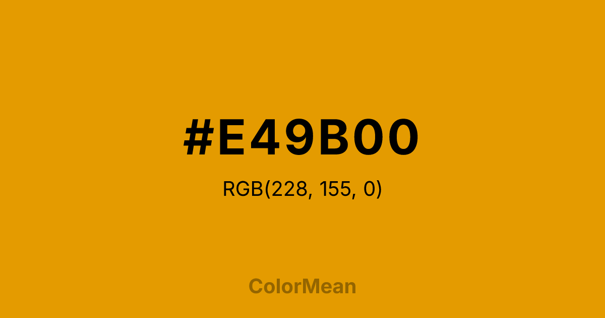 #E49B00 RGB value is (228, 155, 0). The hex color red value is 228, green is 155, and blue is 0. Its HSL format shows a hue of 41°, saturation of 100 percent, and lightness of 45 percent. The CMYK process values are 0 percent, 32 percent, 100 percent, 11 percent.