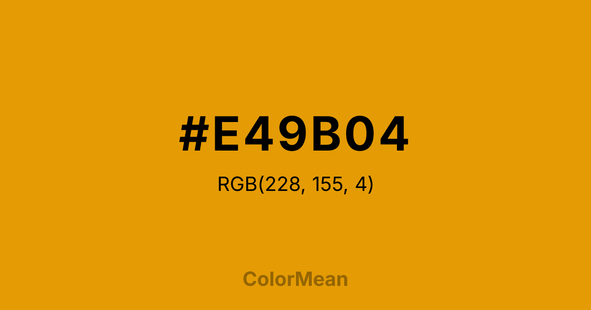 #E49B04 RGB value is (228, 155, 4). The hex color red value is 228, green is 155, and blue is 4. Its HSL format shows a hue of 40°, saturation of 97 percent, and lightness of 45 percent. The CMYK process values are 0 percent, 32 percent, 98 percent, 11 percent.