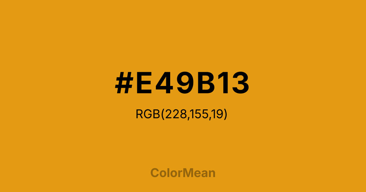 #E49B13 RGB value is (228, 155, 19). The hex color red value is 228, green is 155, and blue is 19. Its HSL format shows a hue of 39°, saturation of 85 percent, and lightness of 48 percent. The CMYK process values are 0 percent, 32 percent, 92 percent, 11 percent.