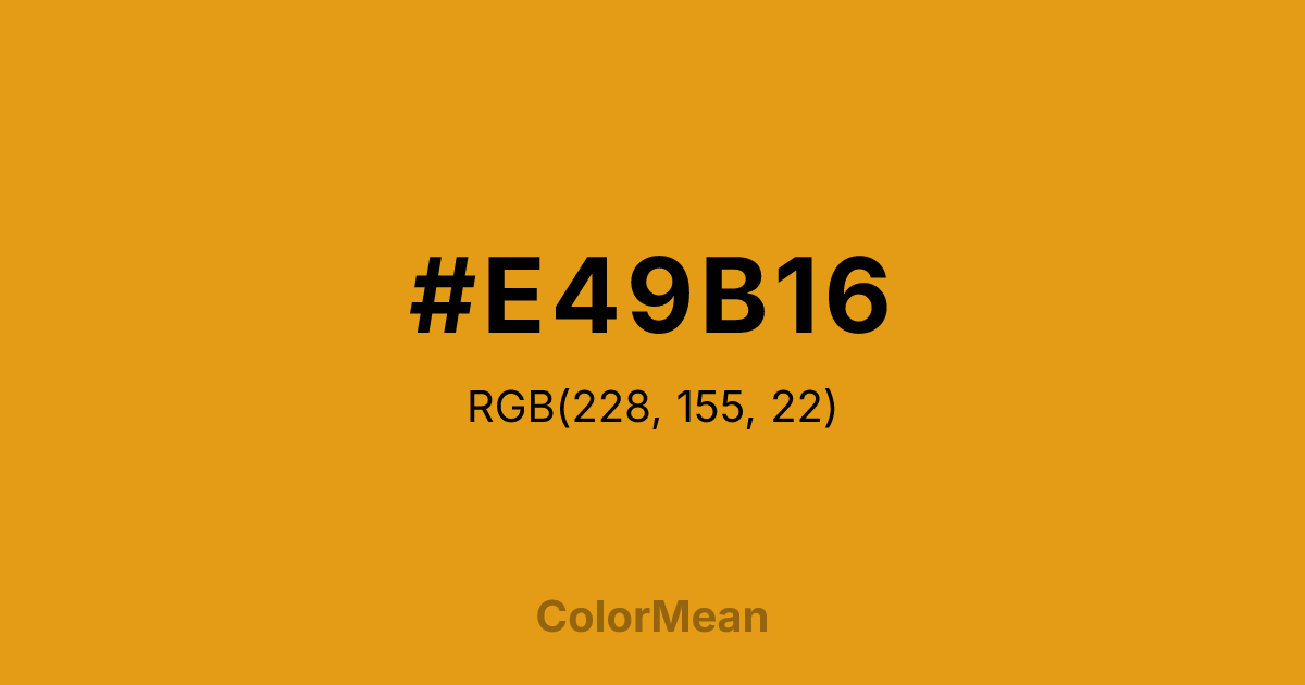 #E49B16 RGB value is (228, 155, 22). The hex color red value is 228, green is 155, and blue is 22. Its HSL format shows a hue of 39°, saturation of 82 percent, and lightness of 49 percent. The CMYK process values are 0 percent, 32 percent, 90 percent, 11 percent.