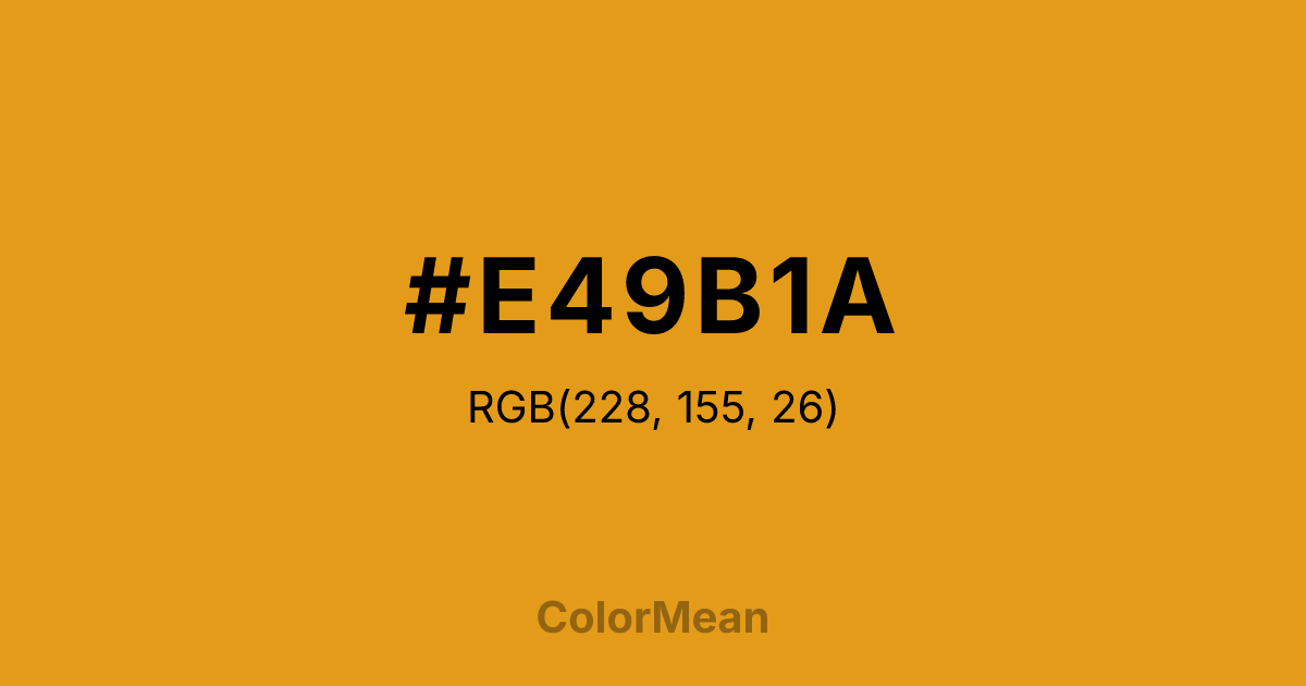 #E49B1A RGB value is (228, 155, 26). The hex color red value is 228, green is 155, and blue is 26. Its HSL format shows a hue of 38°, saturation of 80 percent, and lightness of 50 percent. The CMYK process values are 0 percent, 32 percent, 89 percent, 11 percent.