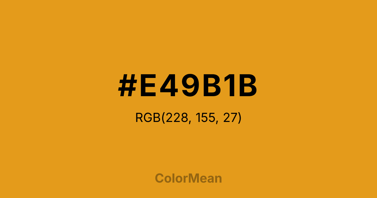 #E49B1B RGB value is (228, 155, 27). The hex color red value is 228, green is 155, and blue is 27. Its HSL format shows a hue of 38°, saturation of 79 percent, and lightness of 50 percent. The CMYK process values are 0 percent, 32 percent, 88 percent, 11 percent.