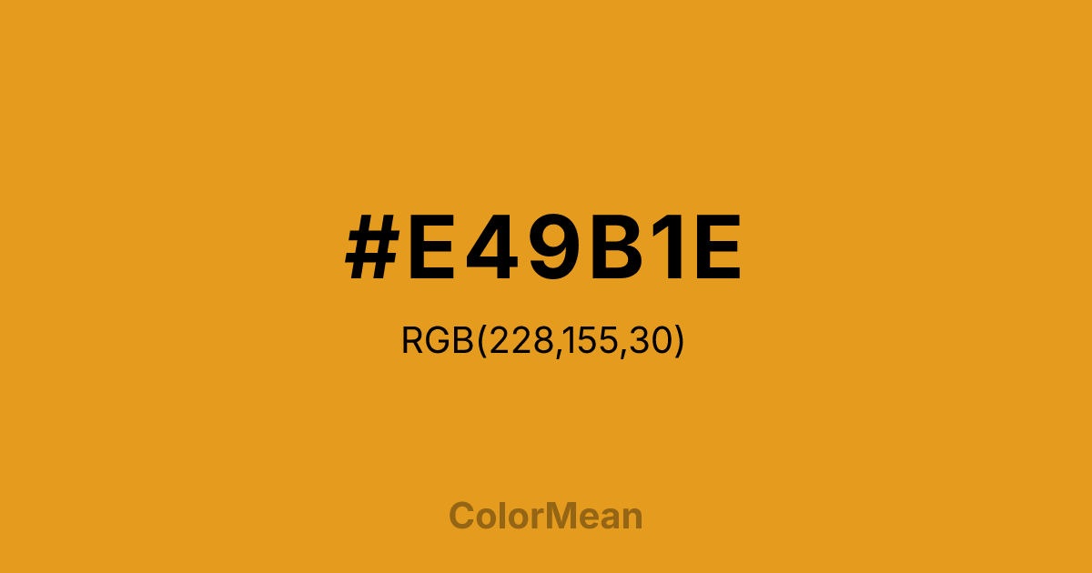 #E49B1E RGB value is (228, 155, 30). The hex color red value is 228, green is 155, and blue is 30. Its HSL format shows a hue of 38°, saturation of 79 percent, and lightness of 51 percent. The CMYK process values are 0 percent, 32 percent, 87 percent, 11 percent.