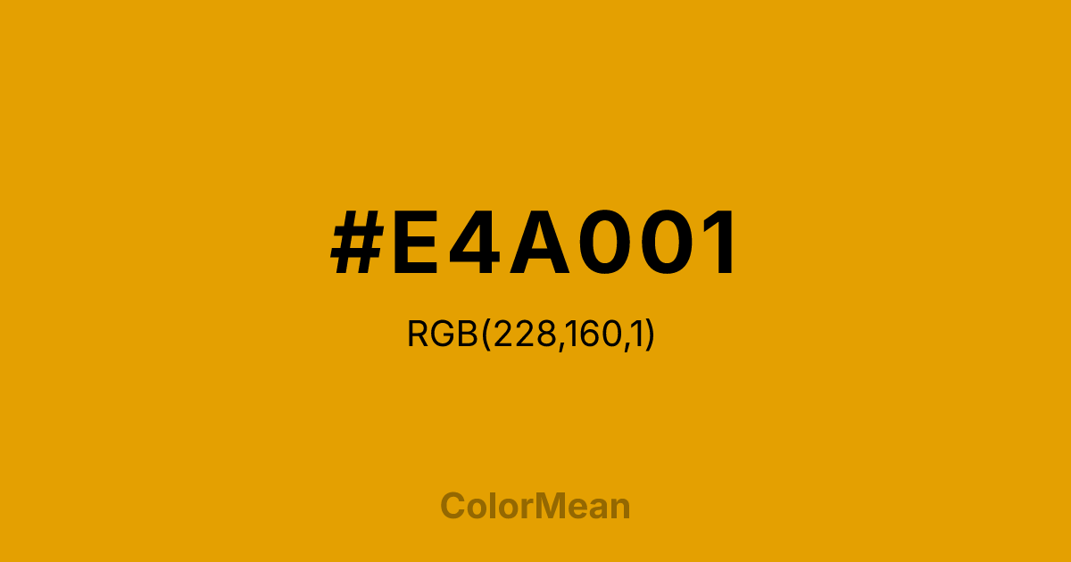 #E4A001 RGB value is (228, 160, 1). The hex color red value is 228, green is 160, and blue is 1. Its HSL format shows a hue of 42°, saturation of 99 percent, and lightness of 45 percent. The CMYK process values are 0 percent, 30 percent, 100 percent, 11 percent.