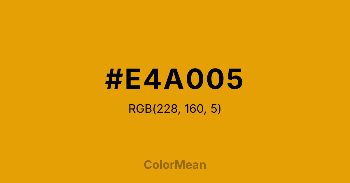 #E4A005 RGB value is (228, 160, 5). The hex color red value is 228, green is 160, and blue is 5. Its HSL format shows a hue of 42°, saturation of 96 percent, and lightness of 46 percent. The CMYK process values are 0 percent, 30 percent, 98 percent, 11 percent.