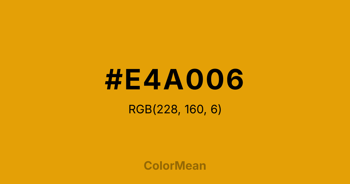 #E4A006 RGB value is (228, 160, 6). The hex color red value is 228, green is 160, and blue is 6. Its HSL format shows a hue of 42°, saturation of 95 percent, and lightness of 46 percent. The CMYK process values are 0 percent, 30 percent, 97 percent, 11 percent.