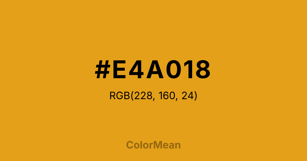 #E4A018 RGB value is (228, 160, 24). The hex color red value is 228, green is 160, and blue is 24. Its HSL format shows a hue of 40°, saturation of 81 percent, and lightness of 49 percent. The CMYK process values are 0 percent, 30 percent, 89 percent, 11 percent.