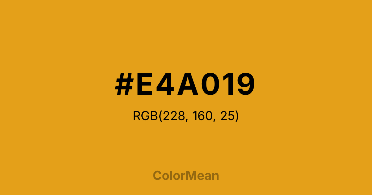 #E4A019 RGB value is (228, 160, 25). The hex color red value is 228, green is 160, and blue is 25. Its HSL format shows a hue of 40°, saturation of 80 percent, and lightness of 50 percent. The CMYK process values are 0 percent, 30 percent, 89 percent, 11 percent.